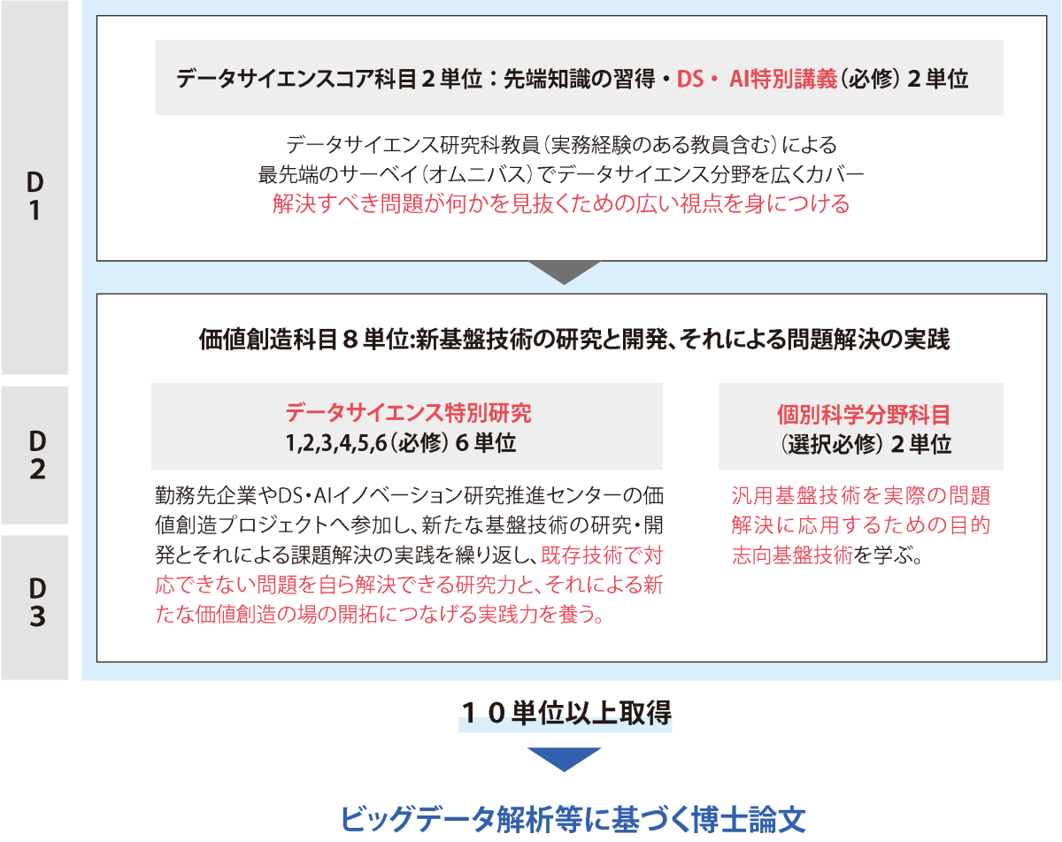 必修のデータサイエンスコア科目において、データサイエンスの先端知識の習得、修了研究のテーマを具体化するためのサーベイや探究的研究を主に行います。 - D2(2年次)・D3(3年次)
