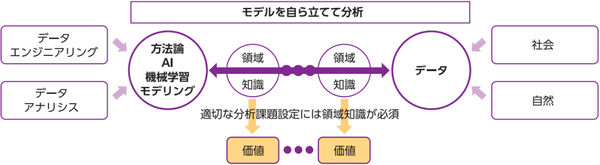 データを活かすには、多くのプロセスがあります。課題を見つけ、領域のデータを取得して前処理をし、モデルを決め、最適化法を選び、分析結果を解釈し、その結果を周囲にわかりやすく伝え、意思決定に活かす。そのためには、データ分析に必要な環境の設計・開発、運用を行うデータエンジニアリングと、構築したデータ基盤に蓄積されたデータを分析するデータアナリシスの2分野において専門知識とスキルが必要です。