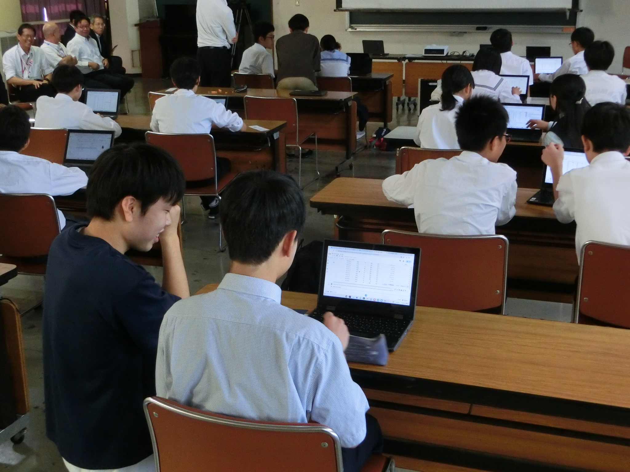 第1回は「データで世界を見てみよう」をテーマに、近江テック・アカデミーの講師(滋賀大学の学生で構成)が17名の生徒にクイズを通して天気予報などの身近なデータ活用事例を紹介。続いて、仮説や目標を設定したうえでデータを取得・分析し、考察・検証するサイクルを意識しながら、スーパーの売上データを分析する演習に取り組みました。