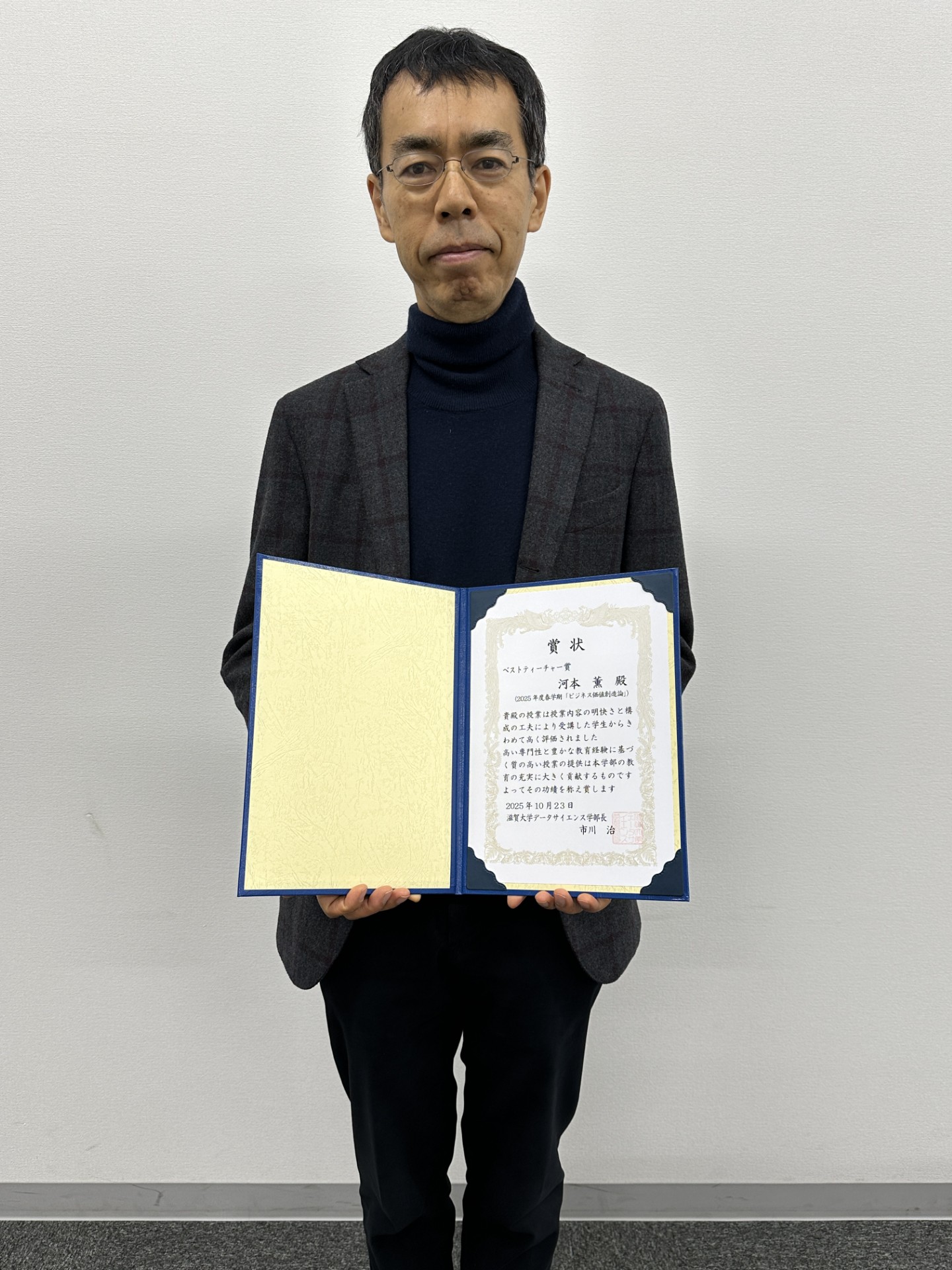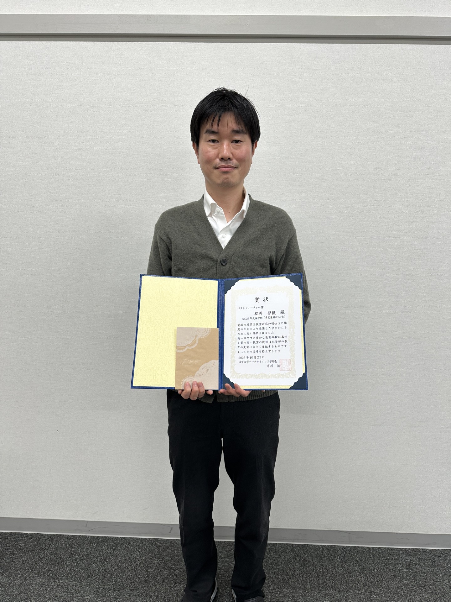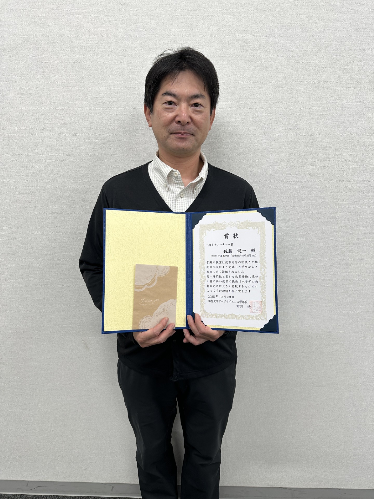 滋賀大学データサイエンス学部では、2025年度から「ベストティーチャー賞」を創設しました。この賞は、学生による授業評価アンケートの結果をもとに、教育内容のわかりやすさや授業運営の工夫などで特に高い評価を得た教員を表彰するものです。学生の学びを第一に考え、教育の質の向上に努める教員の取り組みを称えることを目的としています。